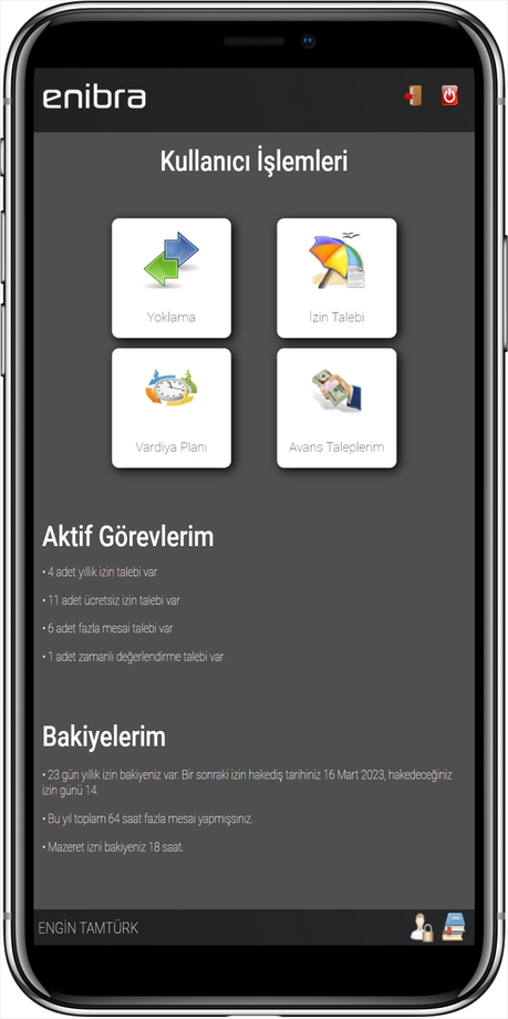 Personeliniz izin taleplerini uygulama üzerinden yapabilir. Amiri önüne düşen talebin onay veya red durumunu görebilir. Talebini iptal edebilir.