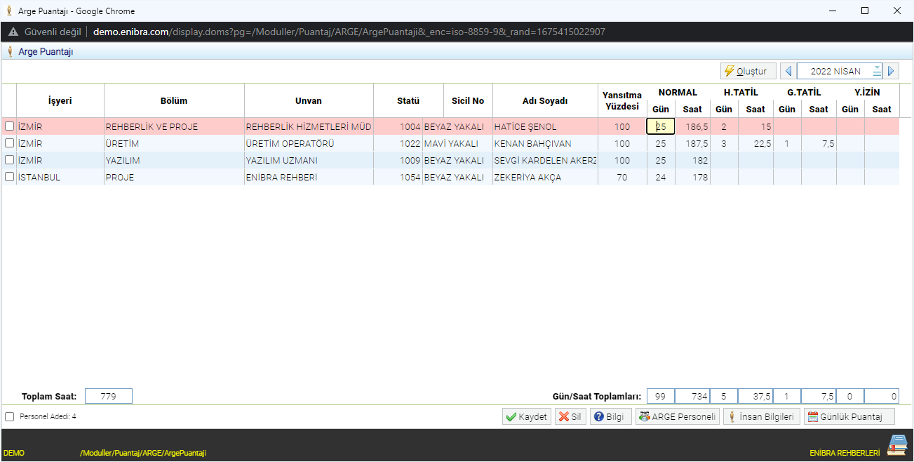 AR-GE Birimi özel AR-GE Puantajını düzenler. Bu puantaj bilgileri enibra Sistemi tarafından oluşturulur, gerekiyorsa AR-GE Sorumlusu puantajda değişiklik yapar.