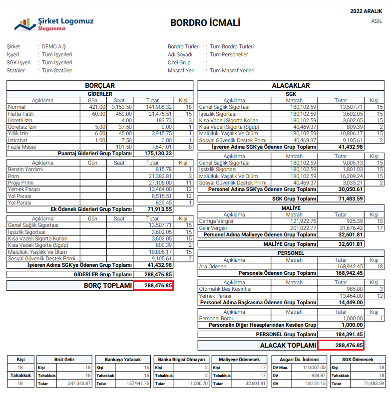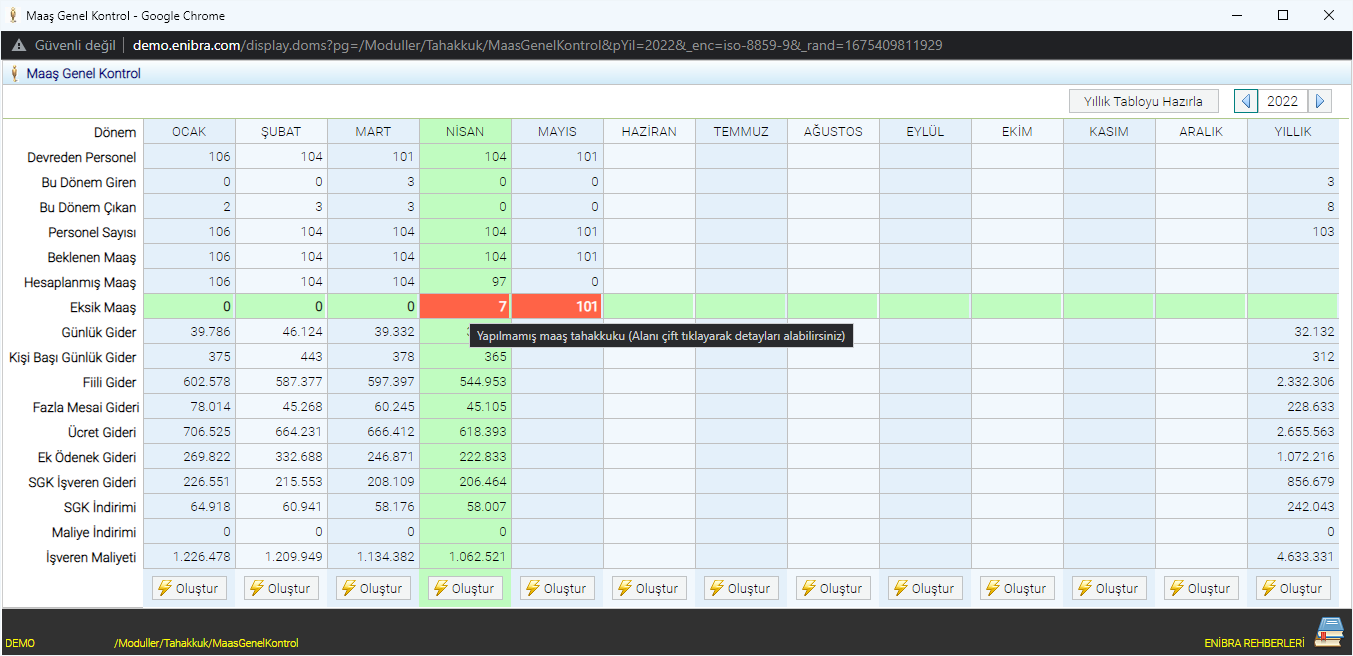 Sistem bütçe tablosunu oluştururken ilgili ayda bulunan tüm personelin maaş ve tazminat (Kıdem ve İhbar Tazminatları) tahakkuklarını yapar, ve bütçe tablosuna müşterimizin belirlediği başlıklar altında yansıtır.