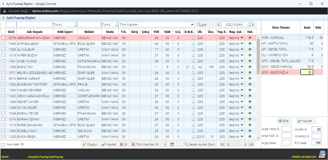 Gece zammı uygulaması varsa sistem gece zamlarını otomatik olarak hesaplar.