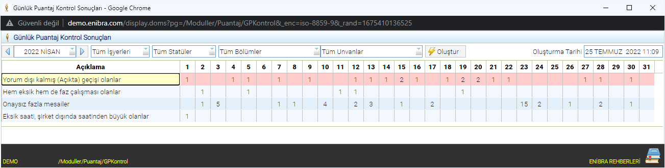 Maaş tahakkukları için her personele aylık puantaj kaydı oluşturmak gerekir. Bunun için sistem ilgili ayın takvimine bakarak kaç iş günü, kaç hafta tatili, kaç genel tatil var bilir ve bu bilgilerle aylık puantaj oluşturur
