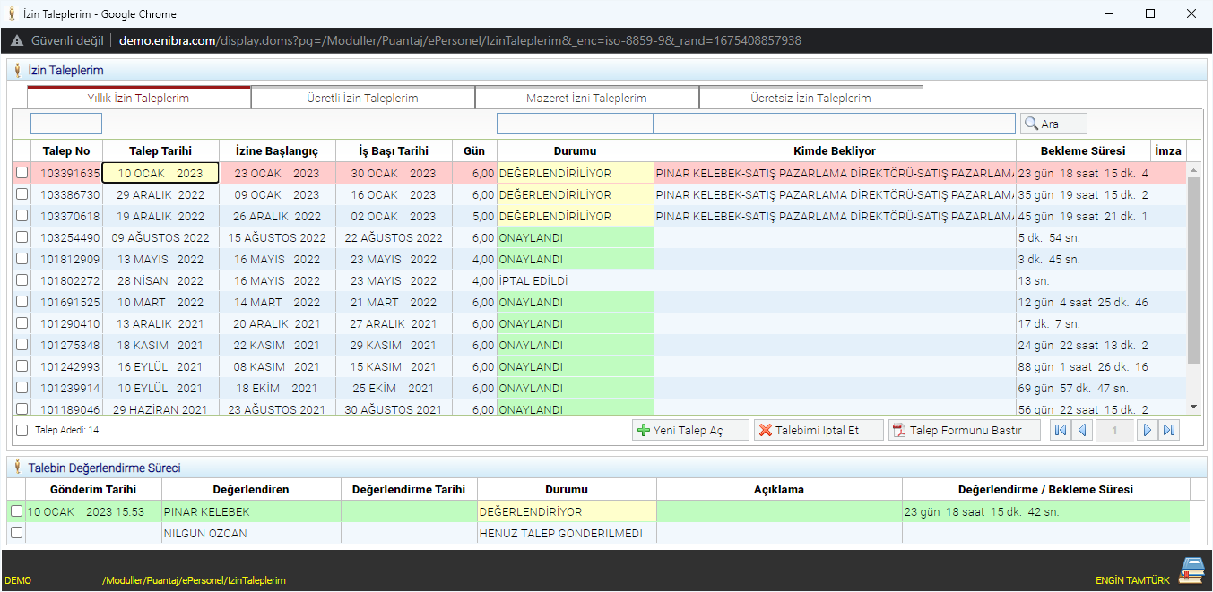 Her personel kendi izin bilgilerini ePersonel Uygulamamız üzerinden görür ve talepte bulunur. İzin talepleri İK Yönetimince belirlenmiş imza rotasını takip ederek kişilere elektronik posta ile bildirilir. Yöneticiler elektronik posta üzerinden onaylama veya reddetme yapabilirler.